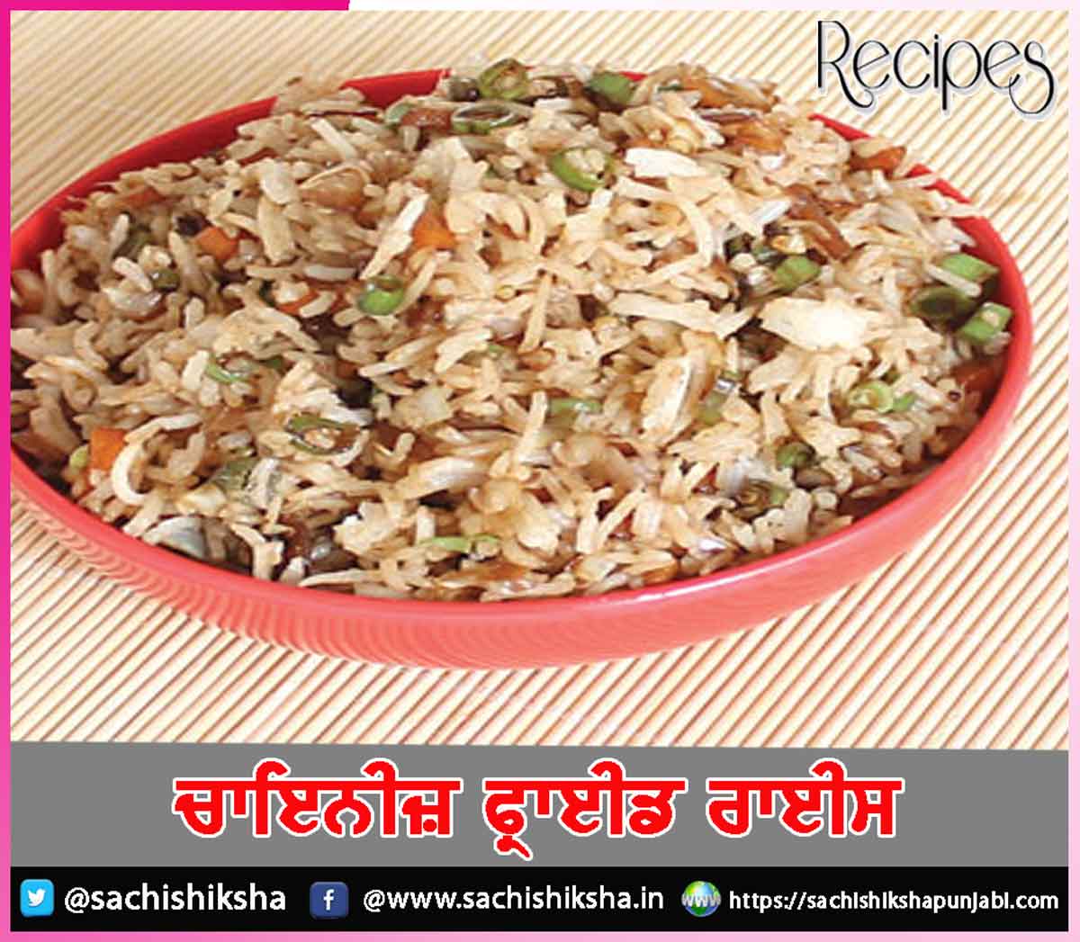 ਕਿ ਸਬਜ਼ੀਆਂ ਜ਼ਿਆਦਾ ਨਾ ਪੱਕਣ, ਉਹ ਪੱਕ ਜਾਣੀਆਂ ਚਾਹੀਦੀਆਂ ਹਨ ਪਰ ਥੋੜ੍ਹੀਆਂ ਕਰਾਰੀਆਂ ਰਹਿਣੀਆਂ ਚਾਹੀਦੀਆਂ ਹਨ (ਮੁਲਾਇਮ ਨਹੀਂ ਹੋਣੀਆਂ ਚਾਹੀਦੀਆਂ) ਕਾਲੀ ਮਿਰਚ ਪਾਊਡਰ, ਸੋਇਆ ਸੌਸ ਤੇ ਨਮਕ ਪਾ ਕੇ ਮਿਲਾ ਲਓ ਪਹਿਲਾਂ ਤੋਂ ਤਿਆਰ ਉੱਬਲੇ ਹੋਏ ਚੌਲ ਪਾਓ ਅਤੇ ਹੌਲੀ-ਹੌਲੀ ਮਿਲਾ ਲਓ ਉਸ ’ਚ ਚਮਚ ਬਹੁਤ ਜ਼ਿਆਦਾ ਚਲਾਓ ਨਾ ਨਹੀਂ ਤਾਂ ਚੌਲਾਂ ਦੇ ਦਾਣੇ ਟੁੱਟ ਸਕਦੇ ਹਨ 2-3 ਮਿੰਟਾਂ ਲਈ ਮੱਧਮ ਸੇਕੇ ’ਤੇ ਪੱਕਣ ਦਿਓ ਹੁਣ ਗੈਸ ਬੰਦ ਕਰੋ ਤੇ ਚਾਇਨੀਜ਼ ਫਰਾਈਡ ਰਾਈਸ ਨੂੰ ਇੱਕ ਕਟੋਰੀ ’ਚ ਕੱਢ ਲਓ ਇਨ੍ਹਾਂ ਨੂੰ ਗਰਮਾ-ਗਰਮ ਮਨਚੂਰੀਅਨ ਗਰੇਵੀ ਨਾਲ ਪਰੋਸੋ