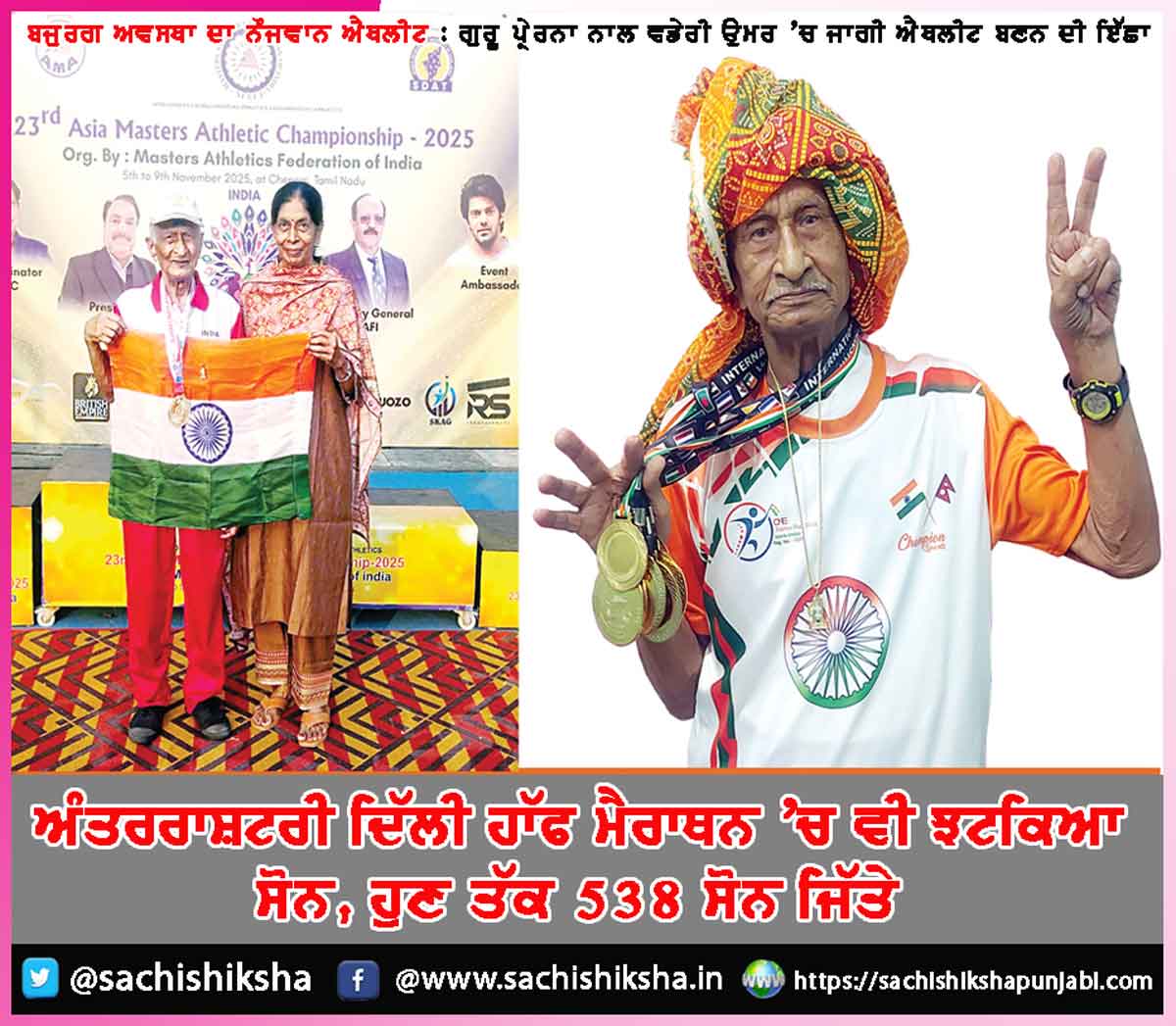 ਜਵਾਹਰ ਲਾਲ ਨਹਿਰੂ ਸਟੇਡੀਅਮ ’ਚ ਖੇਡੀ ਗਈ 23ਵੀਂ ਏਸ਼ੀਆ ਮਾਸਟਰਜ਼ ਐਥਲੈਟਿਕਸ ਚੈਂਪੀਅਨਸ਼ਿਪ ’ਚ ਵਡੇਰੀ ਉਮਰ ਦੇ ਐਥਲੀਟ ਅਤੇ ਸਾਬਕਾ ਪ੍ਰਿੰਸੀਪਲ 94 ਸਾਲਾਂ ਦੇ ਇਲਮ ਚੰਦ ਇੰਸਾਂ ਨੇ ਸ਼ਾਨਦਾਰ ਪ੍ਰਦਰਸ਼ਨ ਕਰਦਿਆਂ ਦੇਸ਼ ਦਾ ਮਾਣ ਵਧਾਇਆ 85 ਪਲੱਸ ਵਰਗ ’ਚ ਮੁਕਾਬਲਾ ਕਰ ਰਹੇ ਇਲਮ ਚੰਦ ਇੰਸਾਂ ਨੇ ਤਿੰਨ ਮੁਕਾਬਲਿਆਂ ’ਚ ਤਗਮੇ ਆਪਣੇ ਨਾਂਅ ਕੀਤੇ 5 ਨਵੰਬਰ ਨੂੰ ਹੋਏ ਟਰਿੱਪਲ ਜੰਪ ਈਵੈਂਟ ’ਚ ਉਨ੍ਹਾਂ ਨੇ ਕਾਂਸੀ ਤਗਮਾ (ਬ੍ਰਾਂਜ ਮੈਡਲ) ਹਾਸਲ ਕੀਤਾ ਇਸ ਤੋਂ ਅਗਲੇ ਦਿਨ, 6 ਨਵੰਬਰ ਨੂੰ ਉੱਚੀ ਛਾਲ (ਹਾਈ ਜੰਪ) ’ਚ ਆਪਣੀ ਉੱਚ ਪ੍ਰਤਿਭਾ ਦਾ ਪ੍ਰਦਰਸ਼ਨ ਕਰਦੇ ਹੋਏ ਚਾਂਦੀ ਤਗਮਾ (ਸਿਲਵਰ ਮੈਡਲ) ਜਿੱਤਿਆ ਇਸਦੇ ਨਾਲ ਹੀ ਸਭ ਤੋਂ ਜ਼ਿਕਰਯੋਗ ਪ੍ਰਾਪਤੀ 7 ਨਵੰਬਰ ਨੂੰ ਰਹੀ ਜਦੋਂ ਉਨ੍ਹਾਂ ਨੇ ਪੋਲ ਵਾਲਟ ਜੰਪ ’ਚ ਸ਼ਾਨਦਾਰ ਪ੍ਰਦਰਸ਼ਨ ਕਰਕੇ ਸੋਨ ਤਗਮਾ ਆਪਣੇ ਨਾਂਅ ਕੀਤਾ ਇਸ ਅੰਤਰਰਾਸ਼ਟਰੀ ਚੈਂਪੀਅਨਸ਼ਿਪ ’ਚ ਭਾਰਤ, ਸ੍ਰੀਲੰਕਾ, ਬੰਗਲਾਦੇਸ਼, ਫਿਲੀਪੀਂਸ, ਈਰਾਨ, ਕਜਾਕਿਸਤਾਨ ਸਮੇਤ 21 ਤੋਂ ਵੱਧ ਦੇਸ਼ਾਂ ਦੇ ਖਿਡਾਰੀਆਂ ਨੇ ਹਿੱਸਾ ਲਿਆ