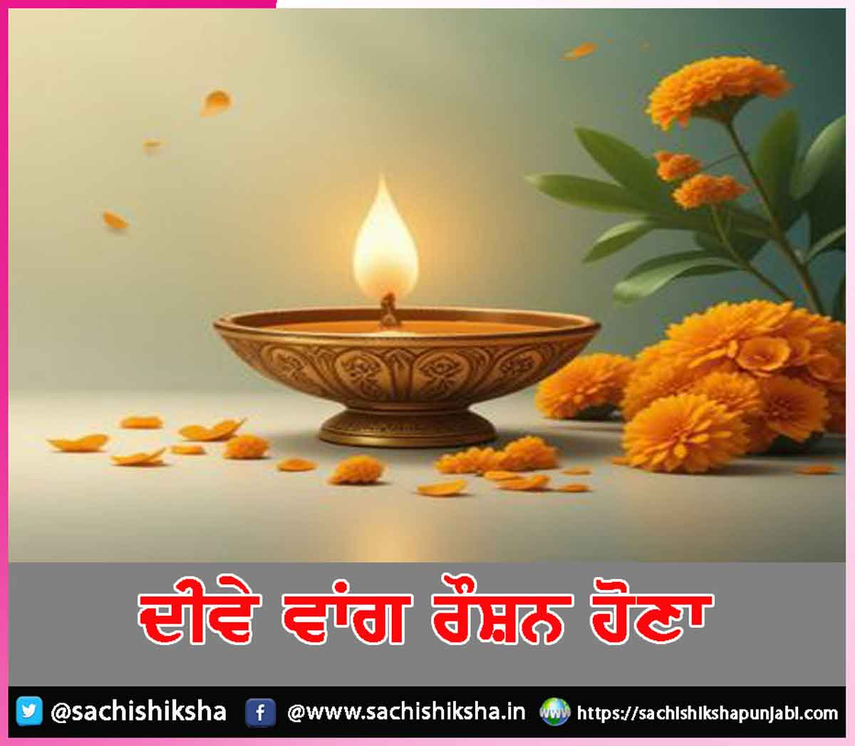 ਦੀਵਾ ਤੇਲ ਦੀ ਚਿਕਨਾਈ ਅਤੇ ਉਸ ਵਿਚ ਪਾਈ ਗਈ ਵੱਤੀ ਨਾਲ ਖੁਦ ਨੂੰ ਬਾਲ਼ ਕੇ ਦੂਜਿਆਂ ਨੂੰ ਚਾਨਣ ਦਿੰਦਾ ਹੈ ਉਸੇ ਤਰ੍ਹਾਂ ਮਨੁੱਖ ਜਦੋਂ ਦੂਜਿਆਂ ਨੂੰ ਆਪਣੇ ਪਿਆਰ ਨਾਲ ਸਰਾਬੋਰ ਕਰਦਾ ਹੈ ਅਤੇ ਆਪਣੇ ਸੰਯਮ ਅਤੇ ਅਨੁਸ਼ਾਸਨਾਤਮਕ ਜੀਵਨ ਨਾਲ ਦੂਜਿਆਂ ’ਤੇ ਆਪਣੀ ਛਾਪ ਛੱਡਣ ’ਚ ਸਫਲ ਹੁੰਦਾ ਹੈ ਤਾਂ ਅਸਲ ’ਚ ਉਹ ਸਮਾਜ ’ਚ ਚਾਨਣ ਫੈਲਾਉਂਦਾ ਹੈ ਸਭ ਦੇ ਲਈ ਪੂਜਨਯੋਗ ਬਣ ਜਾਂਦਾ ਹੈ ਲੋਕ ਉਸ ਨੂੰ ਪਲਕਾਂ ’ਤੇ ਬਿਠਾਉਂਦੇ ਹਨ ਅਜਿਹੇ ਸੱਜਣ ਪੁਰਸ਼ ਸਮਾਜ ਦੇ ਰਾਹ-ਦਸੇਰੇ ਬਣਦੇ ਹਨ ਅਤੇ ਸਭ ਦੇ ਪੂਜਨੀਕ ਹੁੰਦੇ ਹਨ