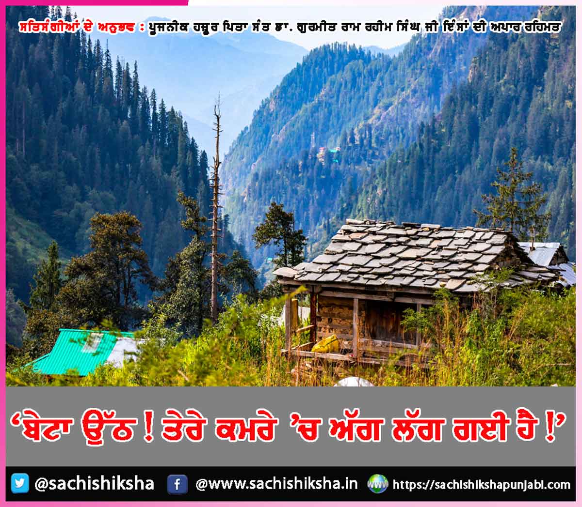 (ਭਾਵ ਦੇਰ ਰਾਤ ਨੂੰ) ਅਚਾਨਕ ਲਾਈਟ ਚਲੀ ਗਈ ਭੈਣ ਨੇ ਰੋਸ਼ਨੀ ਦੇ ਲਈ ਇੱਕ ਮੋਮਬੱਤੀ ਜਲਾ ਦਿੱਤੀ ਅਤੇ ਉਸਨੂੰ ਉੱਥੇ ਹੀ ਨਜ਼ਦੀਕ ਲੱਕੜੀ ਦੇ ਇੱਕ ਮੇਜ਼ ’ਤੇ ਰੱਖ ਦਿੱਤਾ ਅਸੀਂ ਸਾਰੇ ਉਸੇ ਮੇਜ਼ ਦੇ ਕੋਲ ਬੈੱਡ ’ਤੇ ਹੀ ਬੈਠੇ ਸੀ ਗੱਲਾਂ ਕਰਦੇ-ਕਰਦੇ ਕਦੋਂ ਨੀਂਦ ਆ ਗਈ, ਪਤਾ ਹੀ ਨਹੀਂ ਲੱਗਾ ਅਚਾਨਕ ਗਹਿਰੀ ਨੀਂਦ ਵਿੱਚ ਮੈਨੂੰ ਇੱਕ ਸੁਫਨਾ ਆਇਆ ਸੁਫਨੇ ਵਿੱਚ ਮੈਂ ਇਕਦਮ ਤੇਜ਼ ਰੋਸ਼ਨੀ ਦੇਖੀ ਪਰਮ ਪੂਜਨੀਕ ਹਜ਼ੂਰ ਪਿਤਾ ਸੰਤ ਡਾ. ਗੁਰਮੀਤ ਰਾਮ ਰਹੀਮ ਸਿੰਘ ਜੀ ਇੰਸਾਂ ਮੇਰੇ ਅੰਤਰਮੁਖ ਪ੍ਰਗਟ ਹੋਏ ਸਤਿਗੁਰੂ ਜੀ ਆਪਣੀ ਮਧੁਰ ਬਾਣੀ ਵਿੱਚ ਬੋਲੇ, ‘‘ਬੇਟਾ, ਉਠ! ਤੇਰੇ ਕਮਰੇ ’ਚ ਅੱਗ ਲੱਗ ਗਈ ਹੈ’’