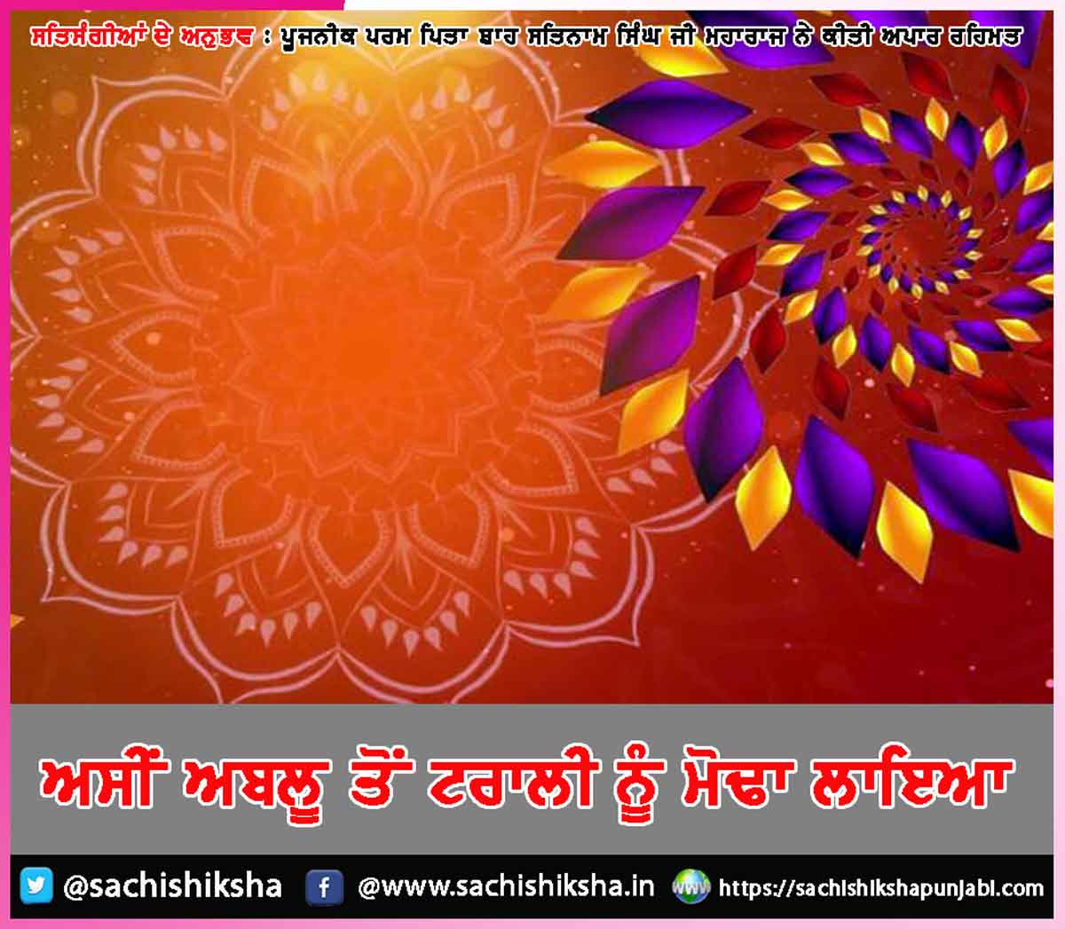 ਅਸੀਂ ਅਬਲੂ ਤੋਂ ਟਰਾਲੀ ਨੂੰ ਮੋਢਾ ਲਾਇਆ -ਸਤਿਸੰਗੀਆਂ ਦੇ ਅਨੁਭਵ -ਪੂਜਨੀਕ ਪਰਮ ਪਿਤਾ ਸ਼ਾਹ ਸਤਿਨਾਮ ਸਿੰਘ ਜੀ ਮਹਾਰਾਜ ਨੇ ਕੀਤੀ ਅਪਾਰ ਰਹਿਮਤ